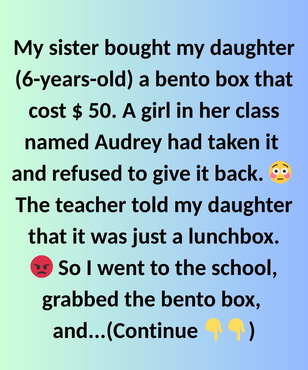 So my sister bought my daughter (6-years-old) a bento box that cost 50 dollars. Thursday after school, my daughter came home, and while unpacking her backpack like I usually do, I noticed that her bento box was not in there. When I asked her where it was, she stated that a girl in her class named Audrey (fake name) had taken it and refused to give it back.