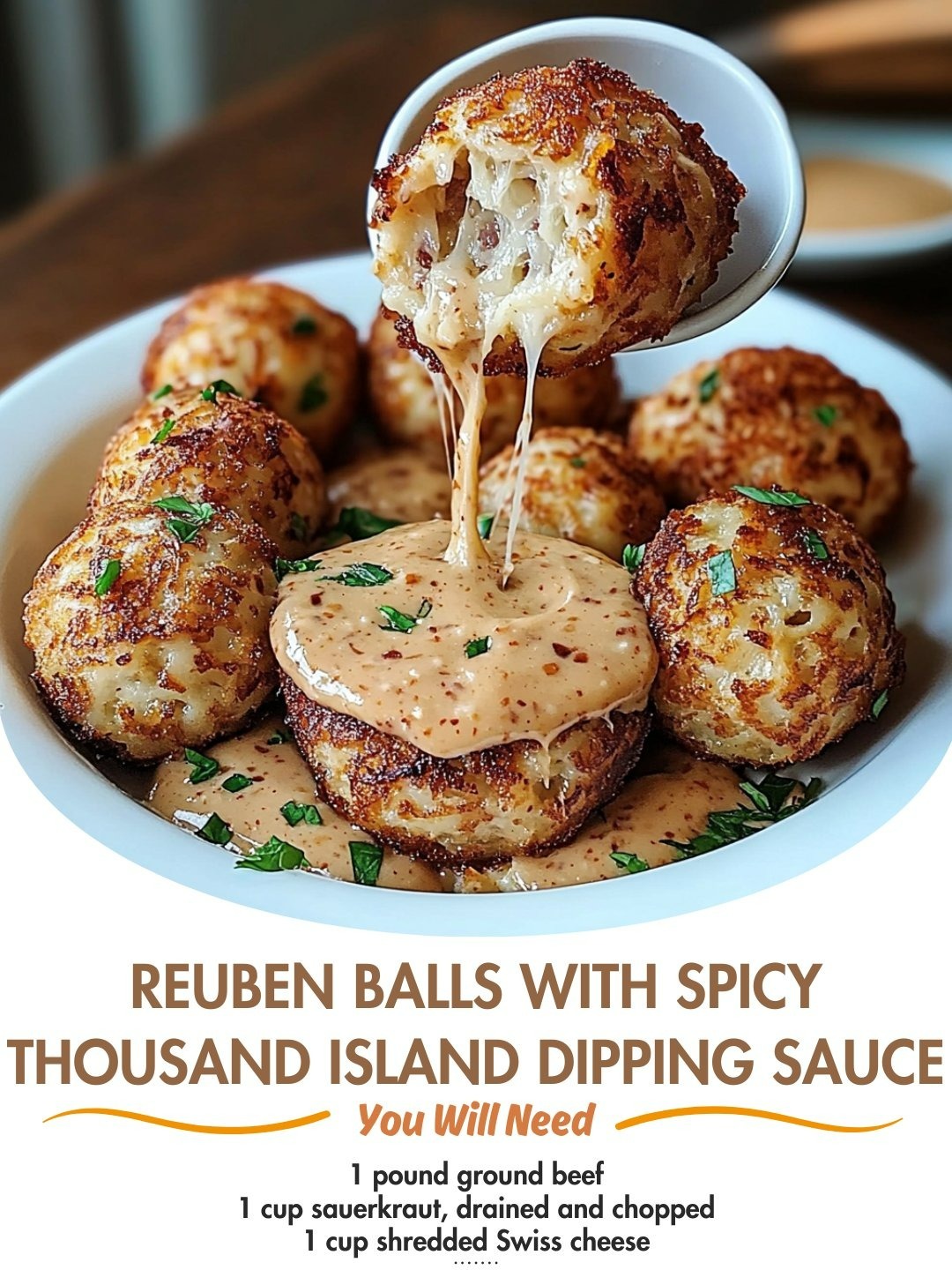 “A fun twist on the classic Reuben sandwich, these crispy, cheesy Reuben balls are paired with a zesty Thousand Island dipping sauce. Perfect for parties or a hearty snack!”