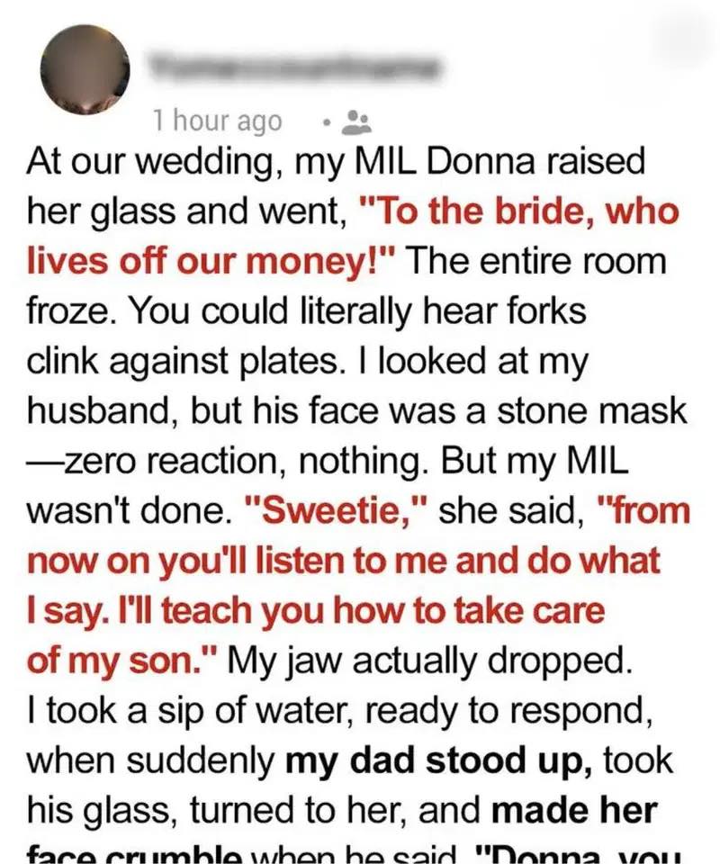 It all shifted when my mother-in-law, Donna, stood to give her toast. She tapped her glass, smiling sweetly as she stood up. Then, her lips curled into a smirk and she said, “Let’s raise a glass to the bride… who depends on our money!”