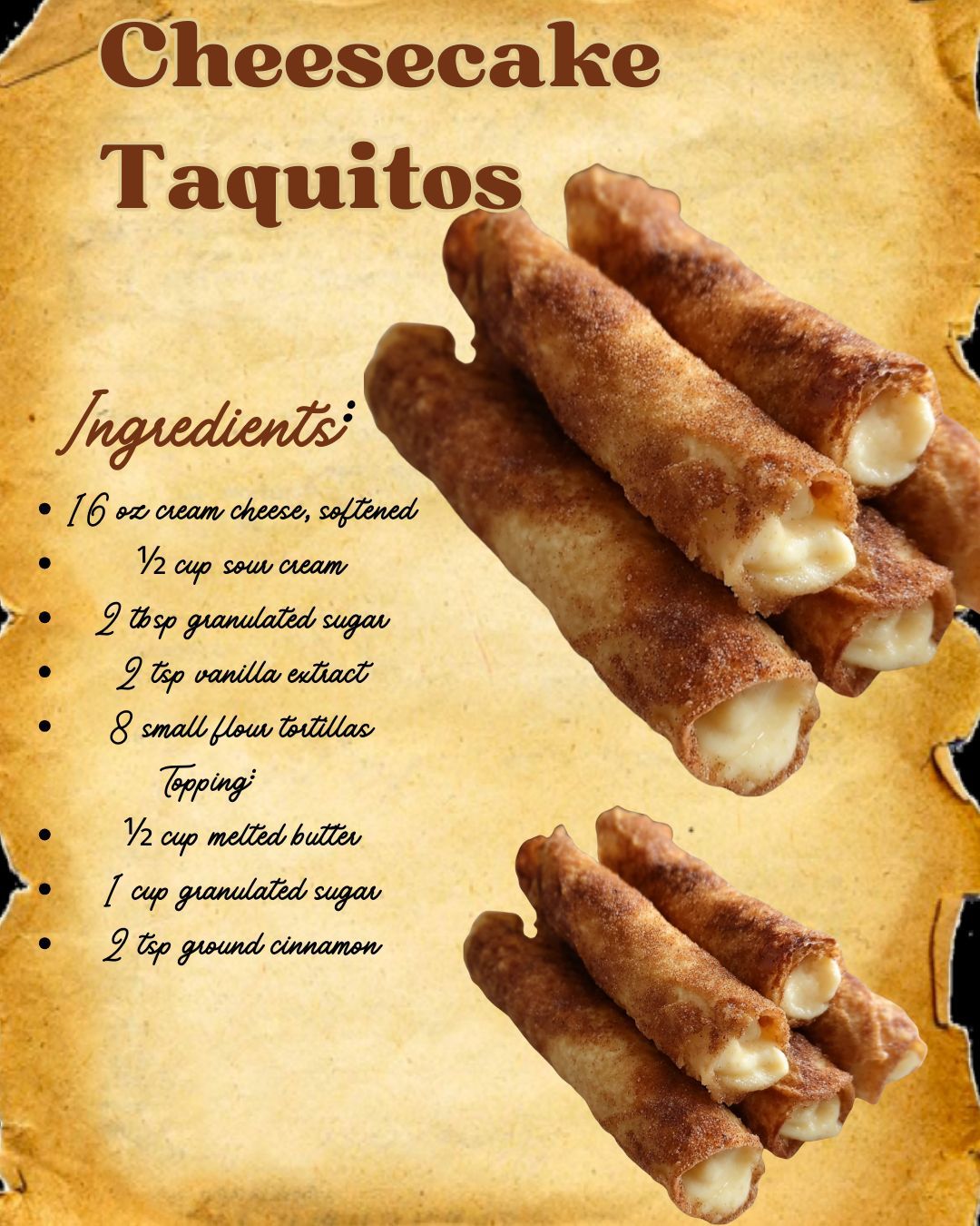 Crispy tortillas filled with a creamy and decadent cheesecake mixture, coated in cinnamon sugar for a delightful sweet and savory fusion treat.