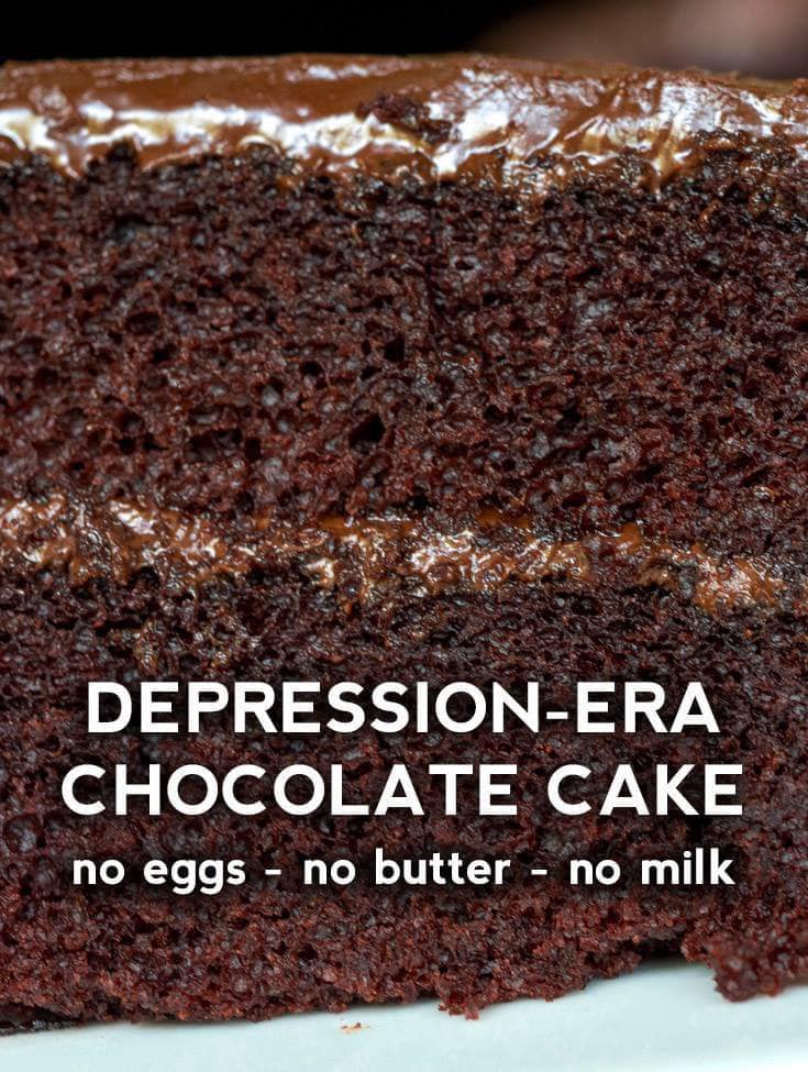 This chocolate depression cake recipe is sometimes called chocolate crazy cake, chocolate wacky crazy cake. or chocolate surprise cake because it is made without eggs, milk, or butter. Which is surprising and sounds both crazy and wacky! The cake rises by using baking soda and vinegar, thus eliminating the need for eggs.