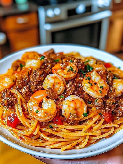 “A bold fusion of juicy shrimp, savory beef, and creamy Cajun-spiced sauce tossed with spaghetti — a mouthwatering meal to elevate your pasta night!”