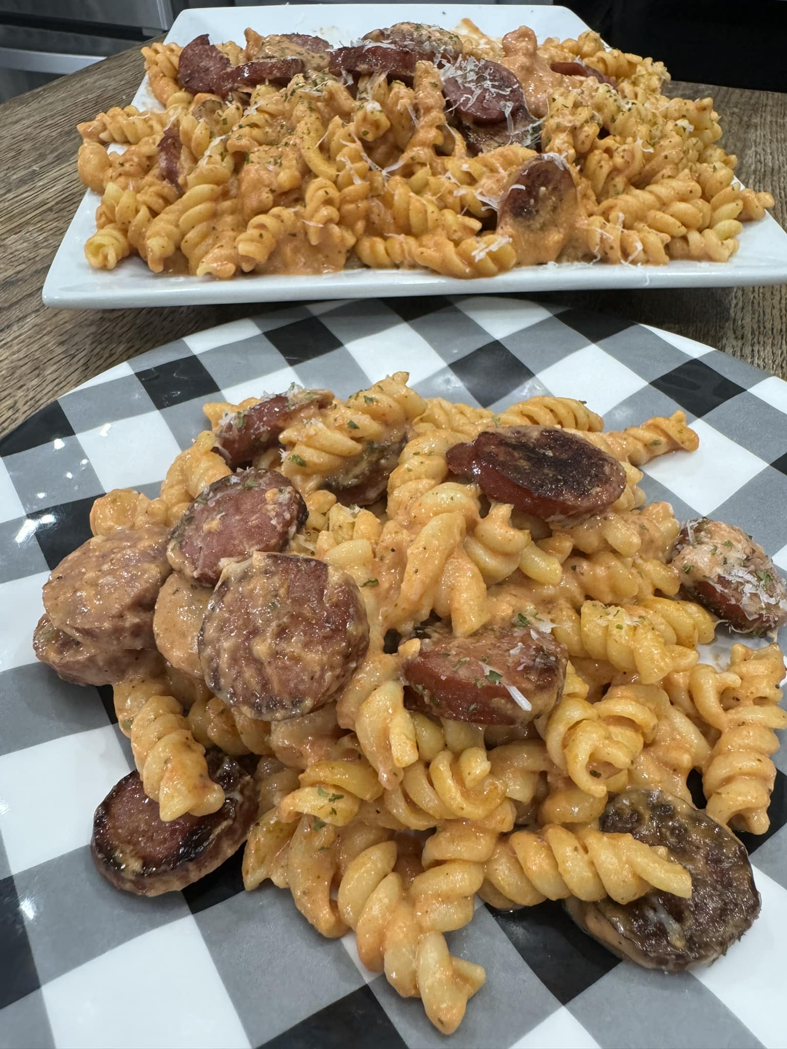 Creamy Smoked Sausage Pasta is an easy weeknight dinner recipe! This recipe comes together pretty quickly and uses ingredients you probably already have in your refrigerator or pantry! I like keeping a beef kielbasa in the refrigerator for nights we forget to get meat out of the freezer.