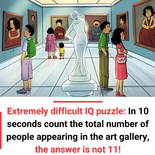 If you look at the picture carefully, you will be able to determine the total number of people inside. If you think the answer is 11, then you are wrong because the picture and the statue are lifeless. If you think the answer is 5, then you are wrong because there is a person hiding behind the picture in the room. Therefore, the correct answer is that there are 6 people inside the gallery.