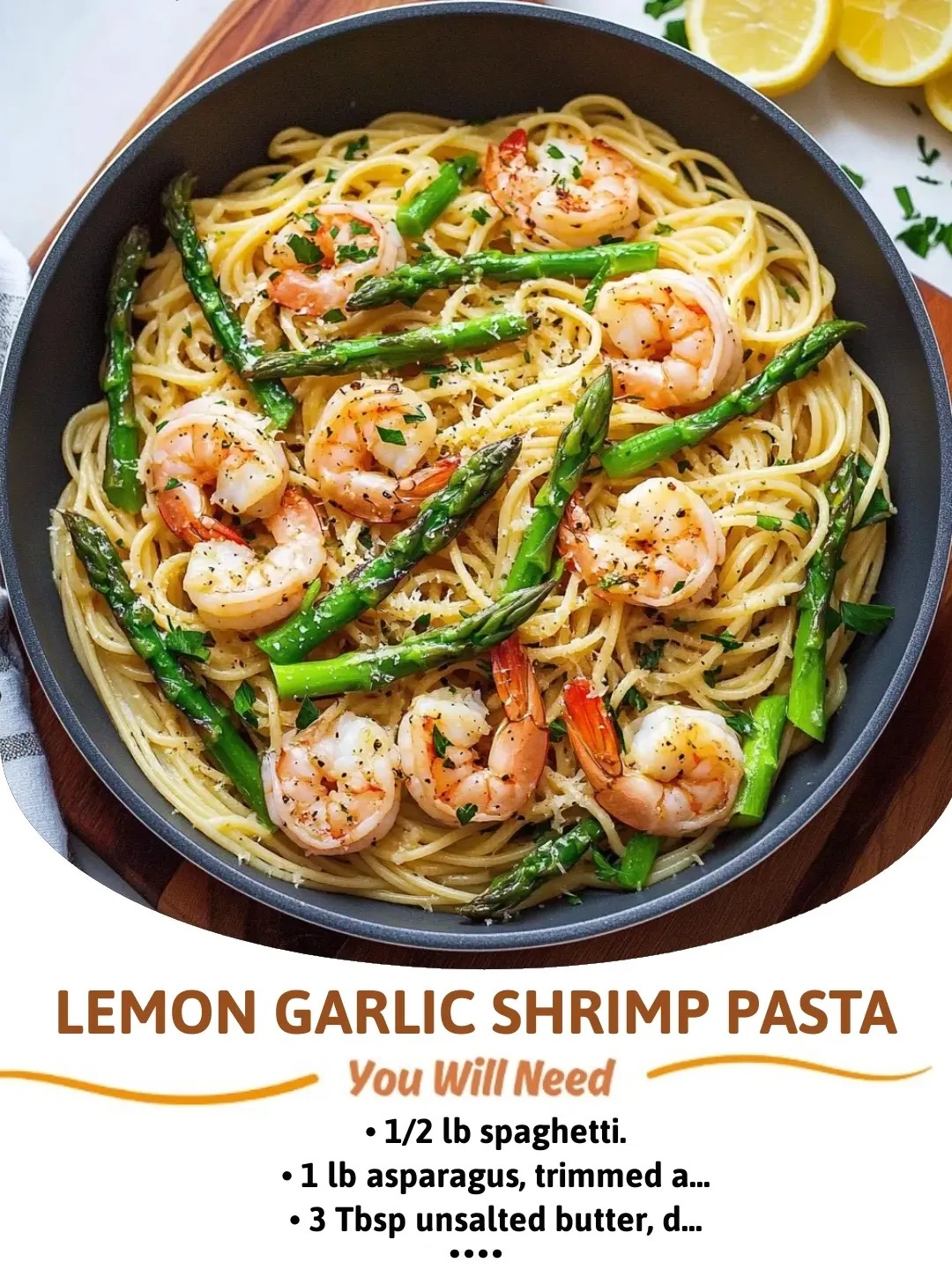 A fresh and vibrant pasta dish featuring garlicky butter shrimp, tender asparagus, and al dente spaghetti tossed in a bright lemon herb sauce.
