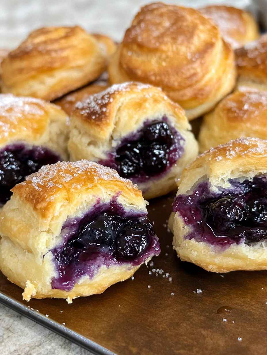 On one particularly hot July afternoon, Grandma pulled me into the kitchen and said, “I have a special summer treat for us today. It’s a secret recipe I’ve been working on just for you!” My eyes grew wide as I watched her pat out rounds of buttery biscuit dough and fill them with vibrant purple pie filling. She sealed them into perfect little balls, brushed them with melted butter, and sprinkled them with sparkling sugar.