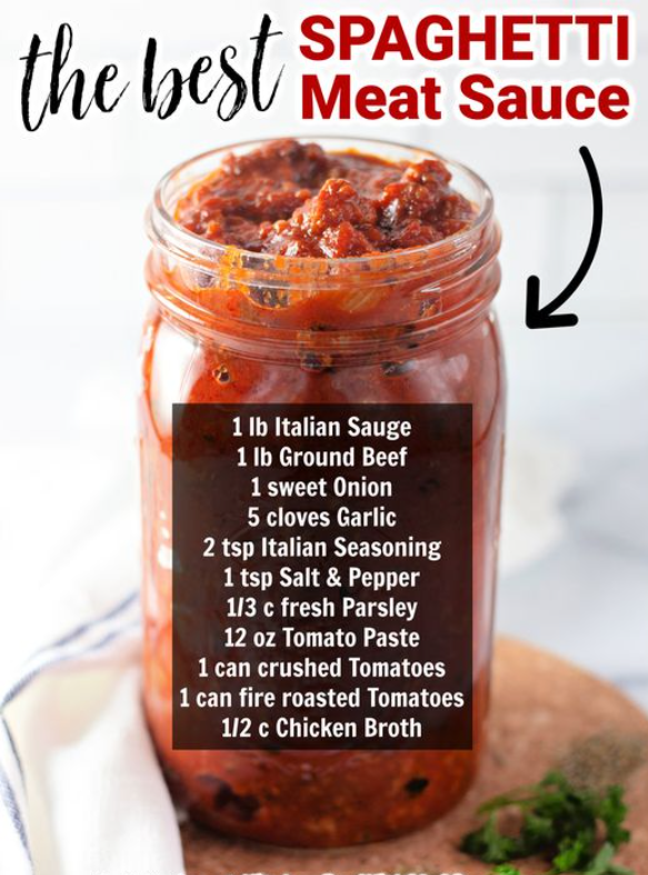 This Homemade Spaghetti Meat Sauce is perfect over your favorite pasta. Crushed tomatoes, onion, garlic, tomato paste, fire roasted tomatoes, spices, Italian sausage, and beef slow simmered for hours to create the most delicious, rich, meaty sauce you’ve ever made.