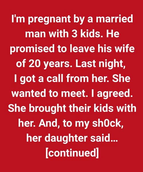 Peut être une image de une personne ou plus et texte qui dit ’I'm pregnant by a married man with 3 kids. He promised to leave his wife of 20 years. Last night, I got a call from her. She wanted to meet. I agreed. She brought their kids with her. And, to my sh0ck, her daughter said... [continued]’