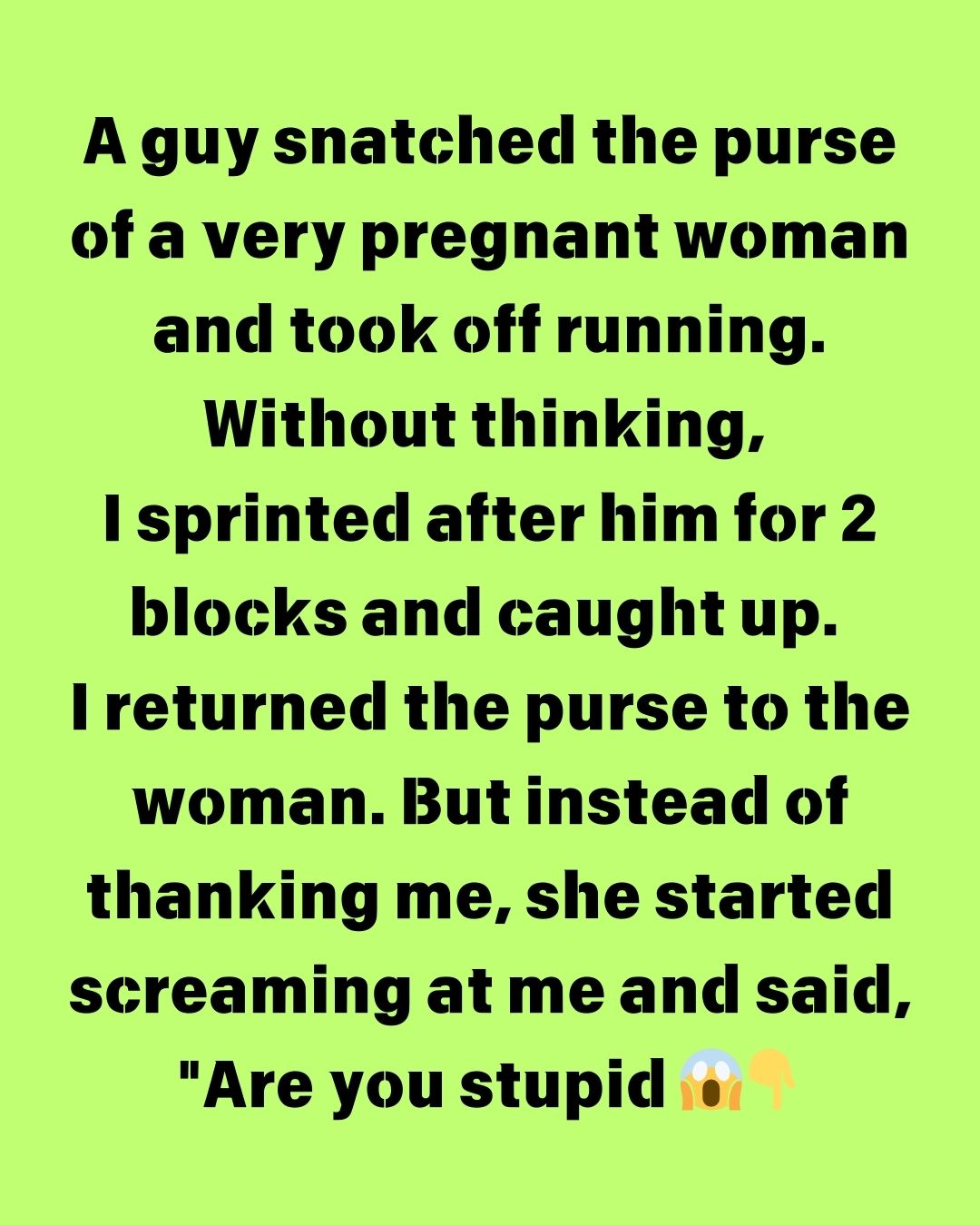 A guy snatched the purse of a very pregnant woman and took off running. Without thinking, I sprinted after him for 2 blocks and caught up. I returned the purse to the woman.