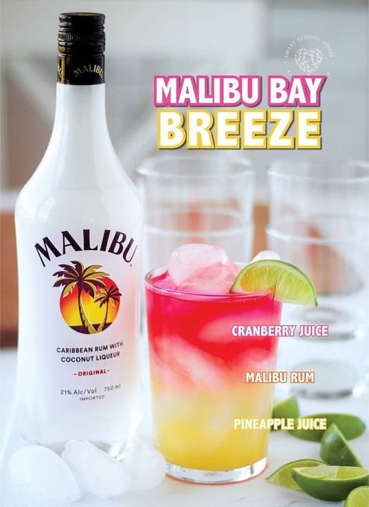 The Drink to Enjoy All Summer Long! Malibu Rum, pineapple Juice, and cranberry juice over ice with a slice of lime