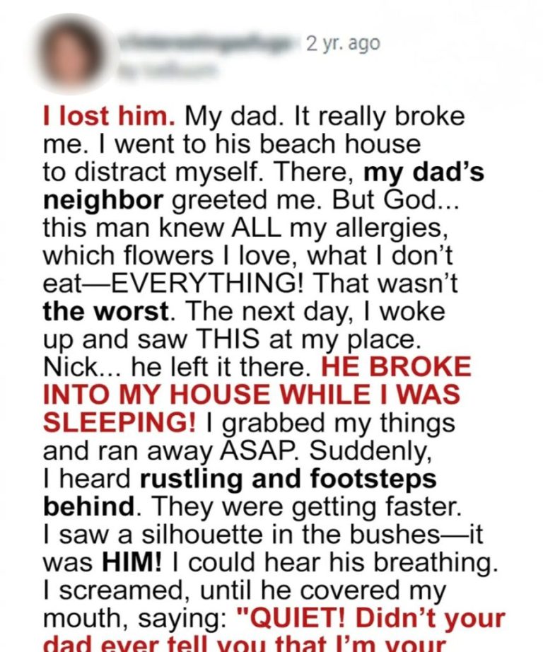After my father passed away, I rented a beach house in a quiet seaside town where he used to retreat from the chaos of the city. I intended it to be a healing journey—a way to feel closer to the man who raised me. The house was exactly as he had described: warm, serene, and surrounded by blooming flowers.