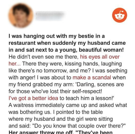 While I was hanging out with my bestie in a restaurant, suddenly my husband came in and sat next to a young, beautiful woman! He didn’t even see me there, his eyes all over her… There they were, kissing hands, laughing like there’s no tomorrow, and me? I was seething with anger!