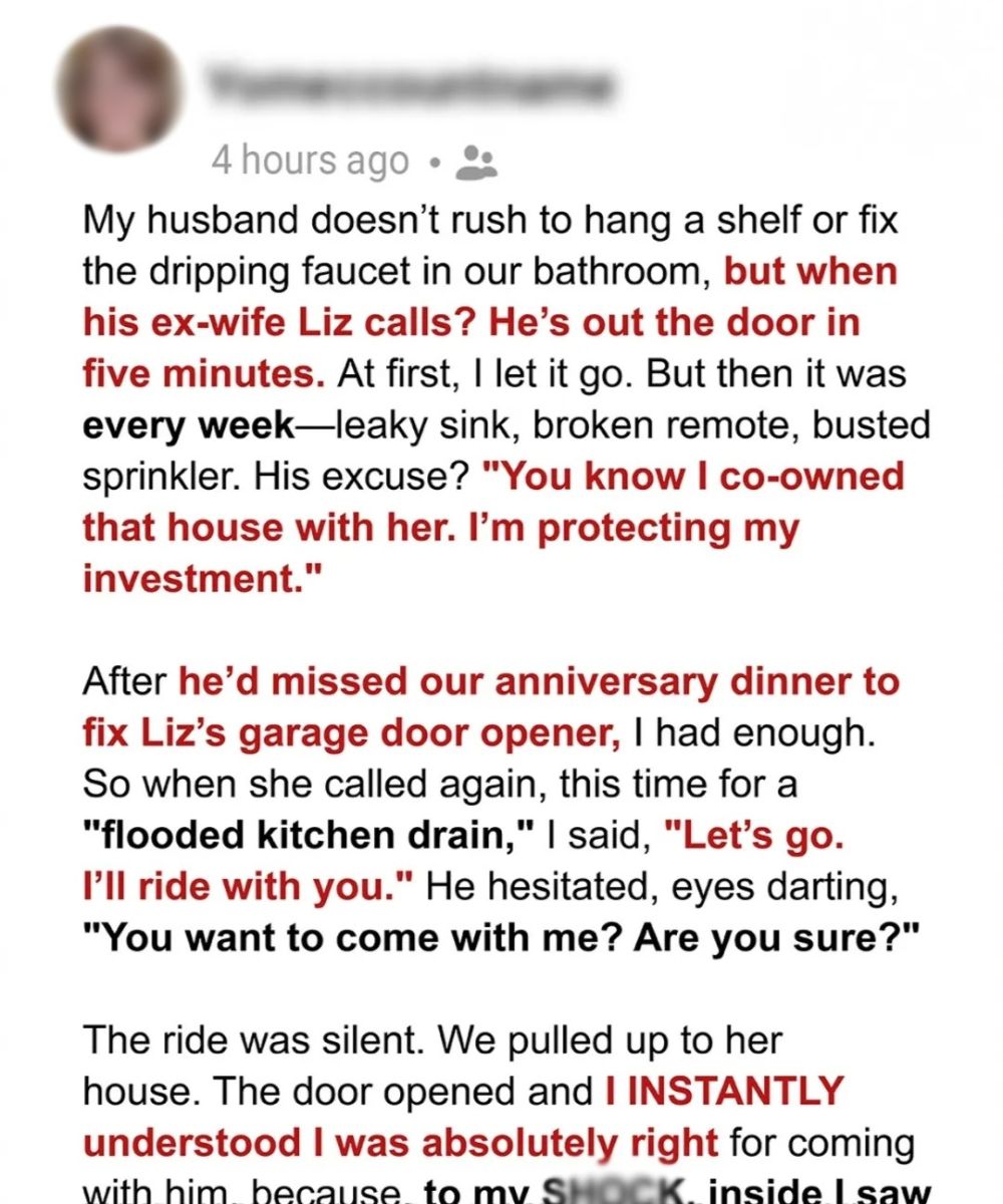 And, as always, my husband dropped everything and ran out the door. This time, I didn’t stay behind then I followed. When we arrived, his ex-wife opened the door in a silk robe, her confident smile freezing when she saw me standing beside him.
