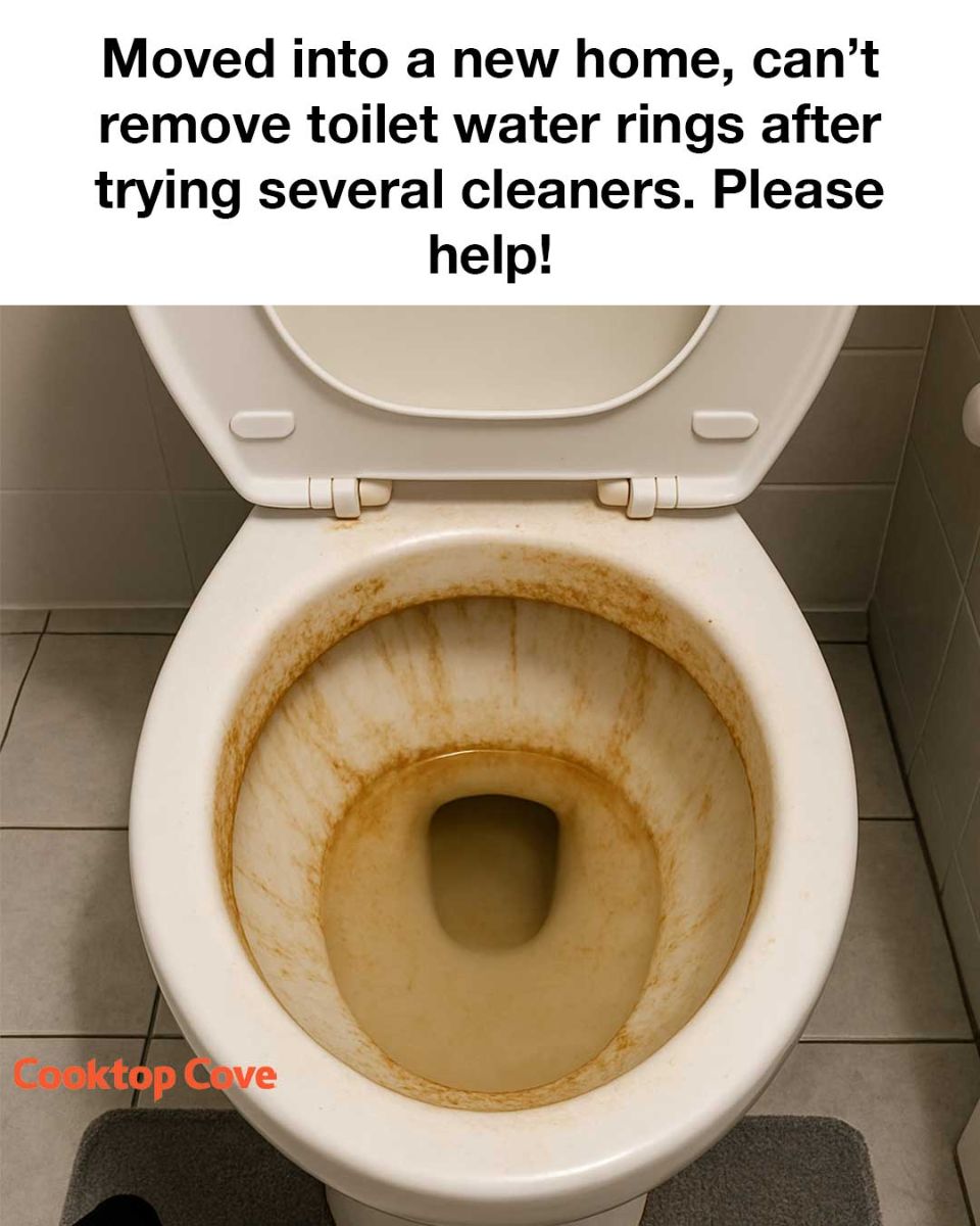 Peut être une image de texte qui dit ’Moved into a new home, can't remove toilet water water rings after trying several cleaners. Please help! Cooktop CooktopCove Cove’