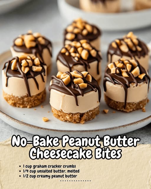 Peut être une image de dessert et texte qui dit ’No-Bake Peanut Butter Cheesecake Bites cup graham cracker crumbs 1/4 c unsalted butter metted 1/2 cp creamy peanut butter ..............’