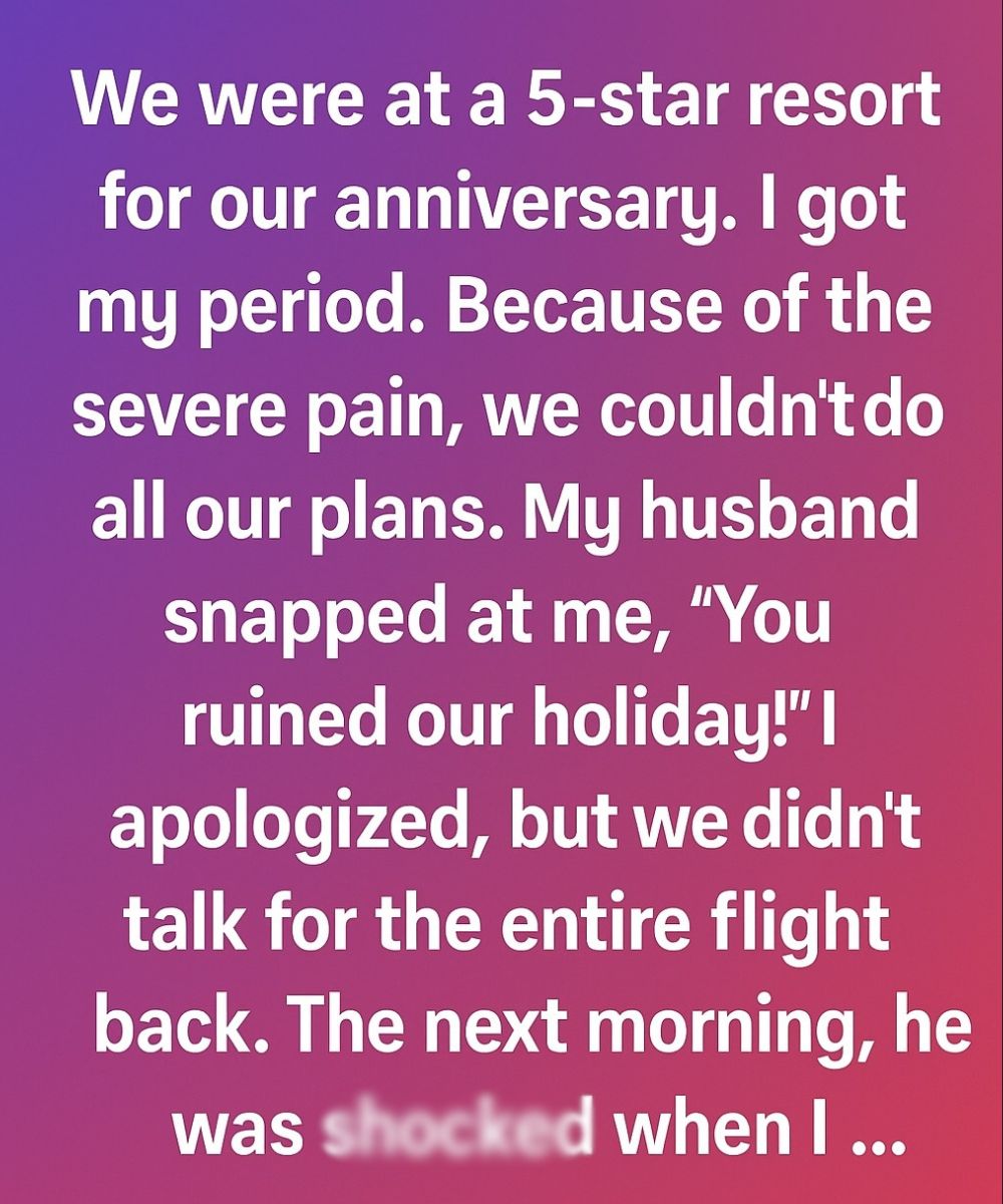 But halfway through the trip, I got my period. The pain was unbearable, and I asked if we could rest for a day. Instead of comfort, my husband’s words cut through me: “You ruined our holiday.” I remember staring at the ocean that night, realizing something inside me had quietly shifted.