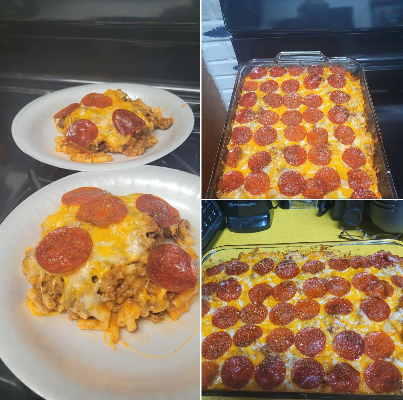 I call this pepperoni bake kids call it delicious 3lbs hamburger cook 2 boxes Mac and cheese cook and dump these 2 and 2 cans of pizza sauce in your baking dish top with cheese and pepperoni add a little garlic seasoning for a pizza taste cook for about 15 mins