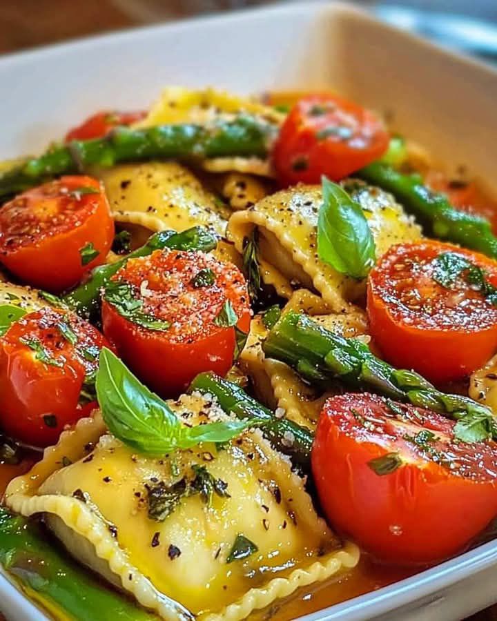 Ravioli with Tomatoes, Asparagus, Garlic, and Herbs