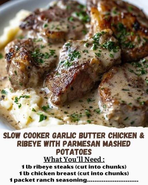 Slow Cooker Garlic Butter Chicken & Ribeye with Parmesan Mashed Potatoes