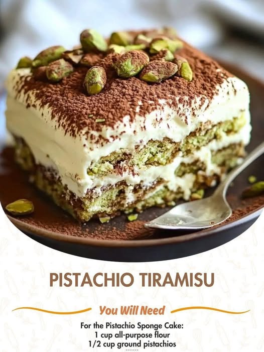 Pistachio Tiramisu is a delicious twist on the classic Italian dessert, featuring layers of fluffy pistachio sponge cake soaked in espresso, paired with a rich mascarpone cream, and topped with crunchy pistachios. This indulgent dessert is perfect for special occasions or as an elegant treat for coffee lovers.
