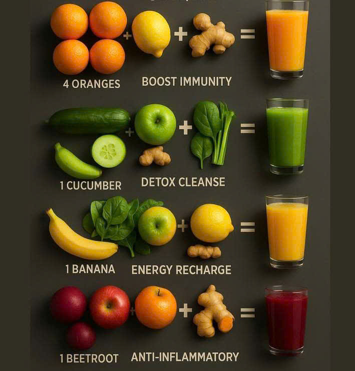 Fuel your body with these four powerful juice combinations made from everyday fruits and vegetables. Whether you’re looking to boost your immune system, detox, recharge your energy, or reduce inflammation, these nutrient-rich blends deliver real health benefits with every sip.