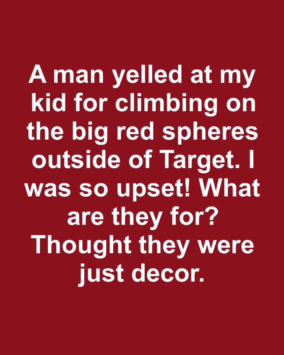 It was a typical weekend afternoon when I took my child to our local Target for some shopping. As we approached the entrance, my child, like many others, was drawn to the large, inviting red spheres that adorn the front of the store. These spheres, seemingly harmless and decorative, have always been a source of fascination for children. However, this time, as my child began to climb on one of them, a man passing by suddenly yelled, expressing his disapproval. I was taken aback, both by his reaction and my own uncertainty about whether my child was in the wrong. This incident left me wondering: what exactly are these big red spheres for, and why did it provoke such a strong reaction from a stranger?