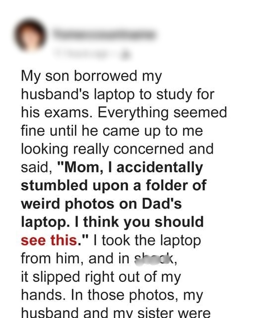 My son stole my husband’s laptop to study for an exam. Everything appeared fine until he approached me, visibly disturbed, and said, “Mom, I unintentionally discovered a folder of strange images on Dad’s PC. I believe you should see this.