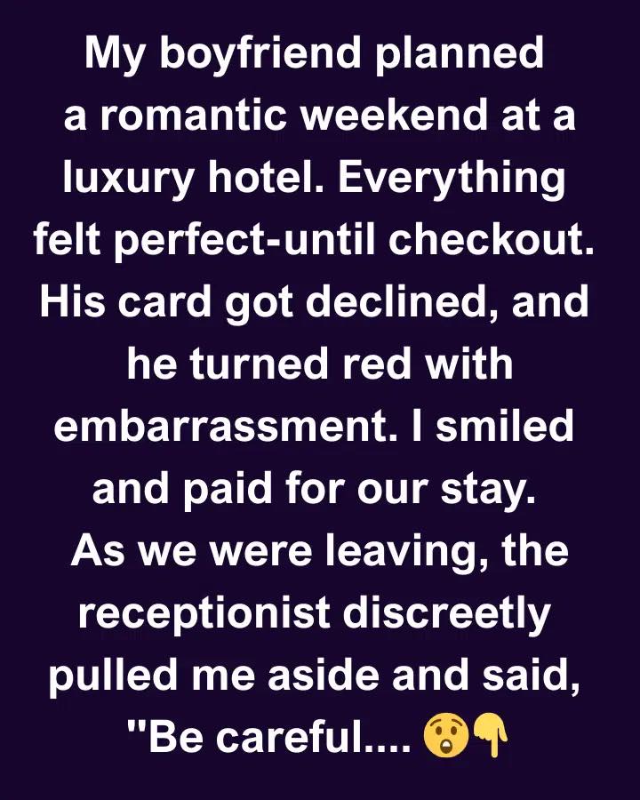 My boyfriend planned a romantic weekend at a luxury hotel. Everything felt perfect—until checkout. His card got declined, and he turned red with embarrassment. I smiled and paid for our stay. As we were leaving, the receptionist discreetly pulled me aside and said, “Be careful, I’ve seen this guy do the same thing with other women. He comes here, his card gets declined, and they end up paying for everything.”