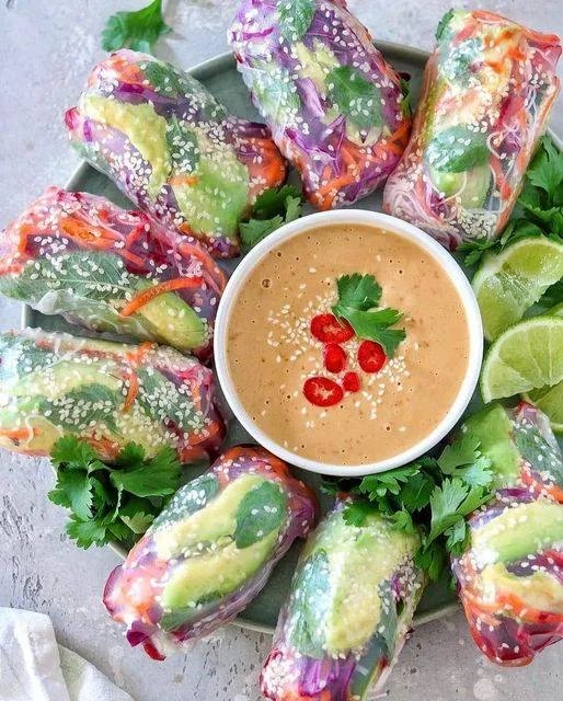Vibrant Vegan rice Paper Rolls with Satay Sauce