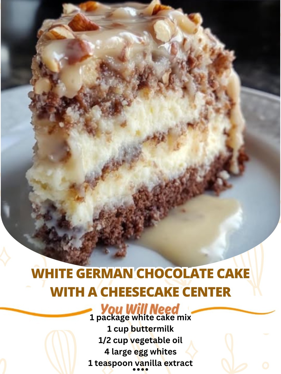 Here’s the full recipe for White German Chocolate Cake with a Cheesecake Center, already included in your document for easy access: